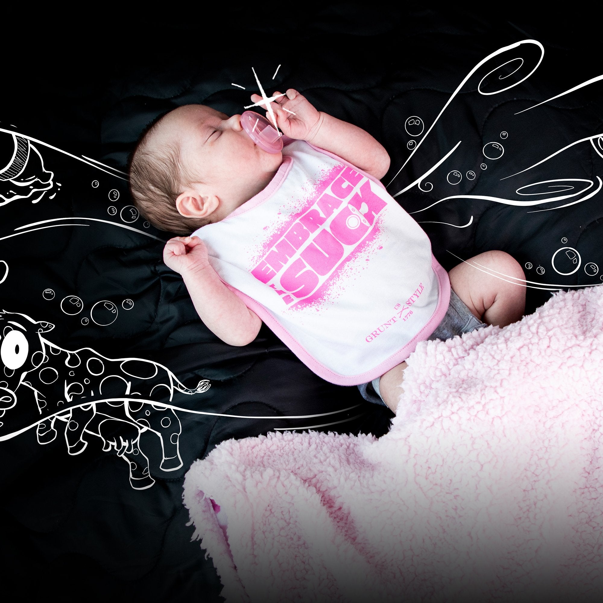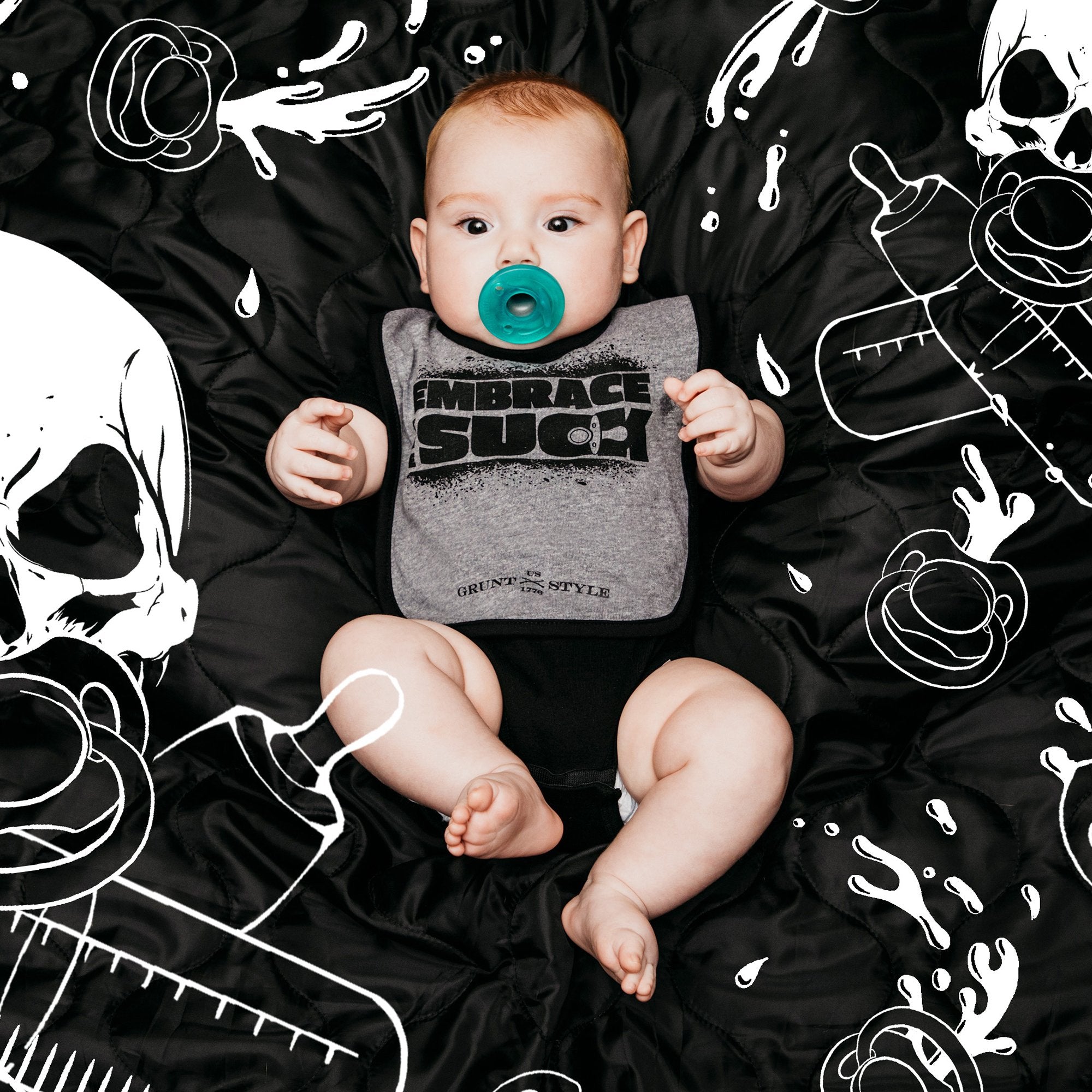 Runt Style's Embrace The Suck Bib is the perfect pairing, catch all bib for the little patriot in your life.