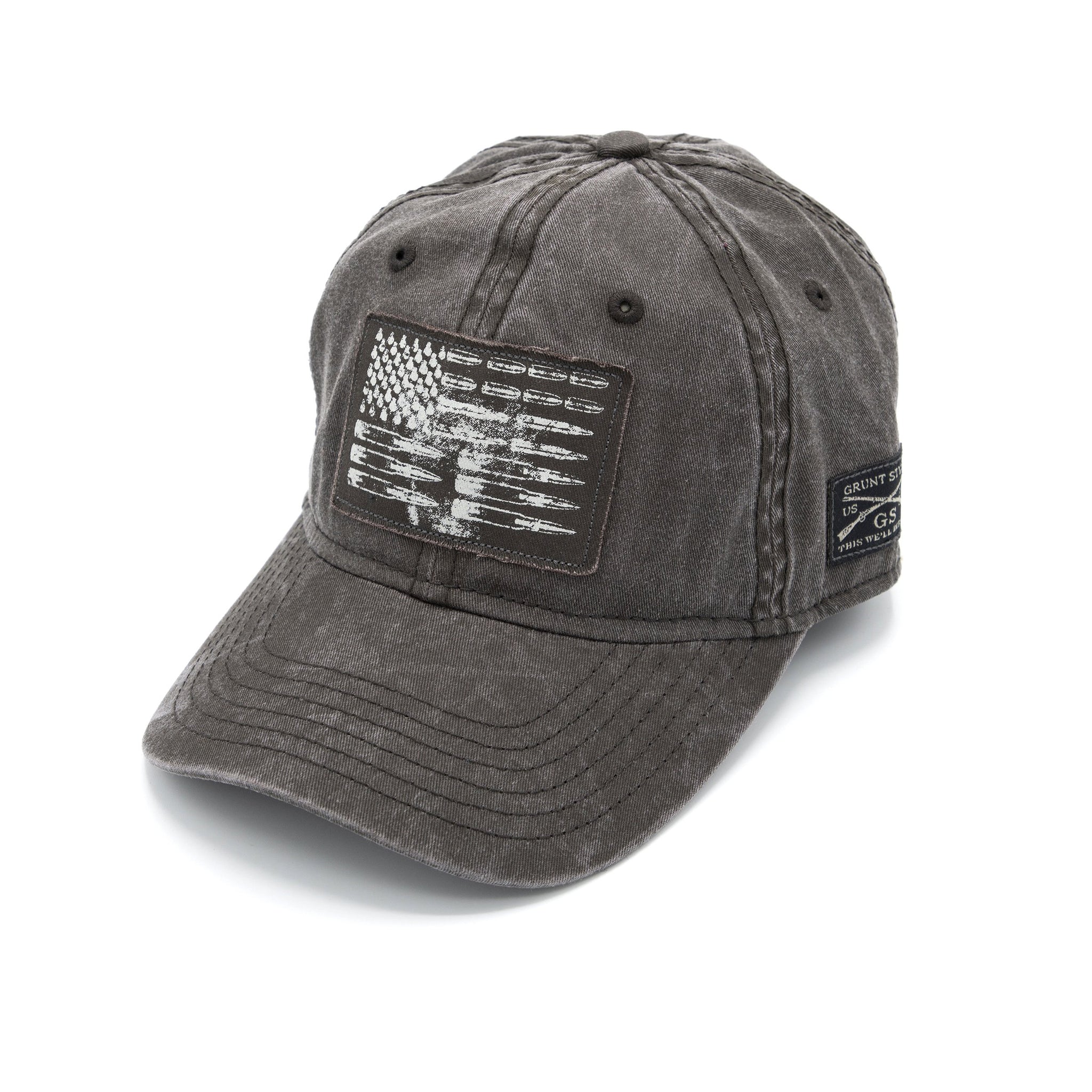 This hat has a vintage Charcoal Wash applied to it to give it that worn in look. This is an unstructured 6 panel cap that features one of our most popular designs Ammo Flag.