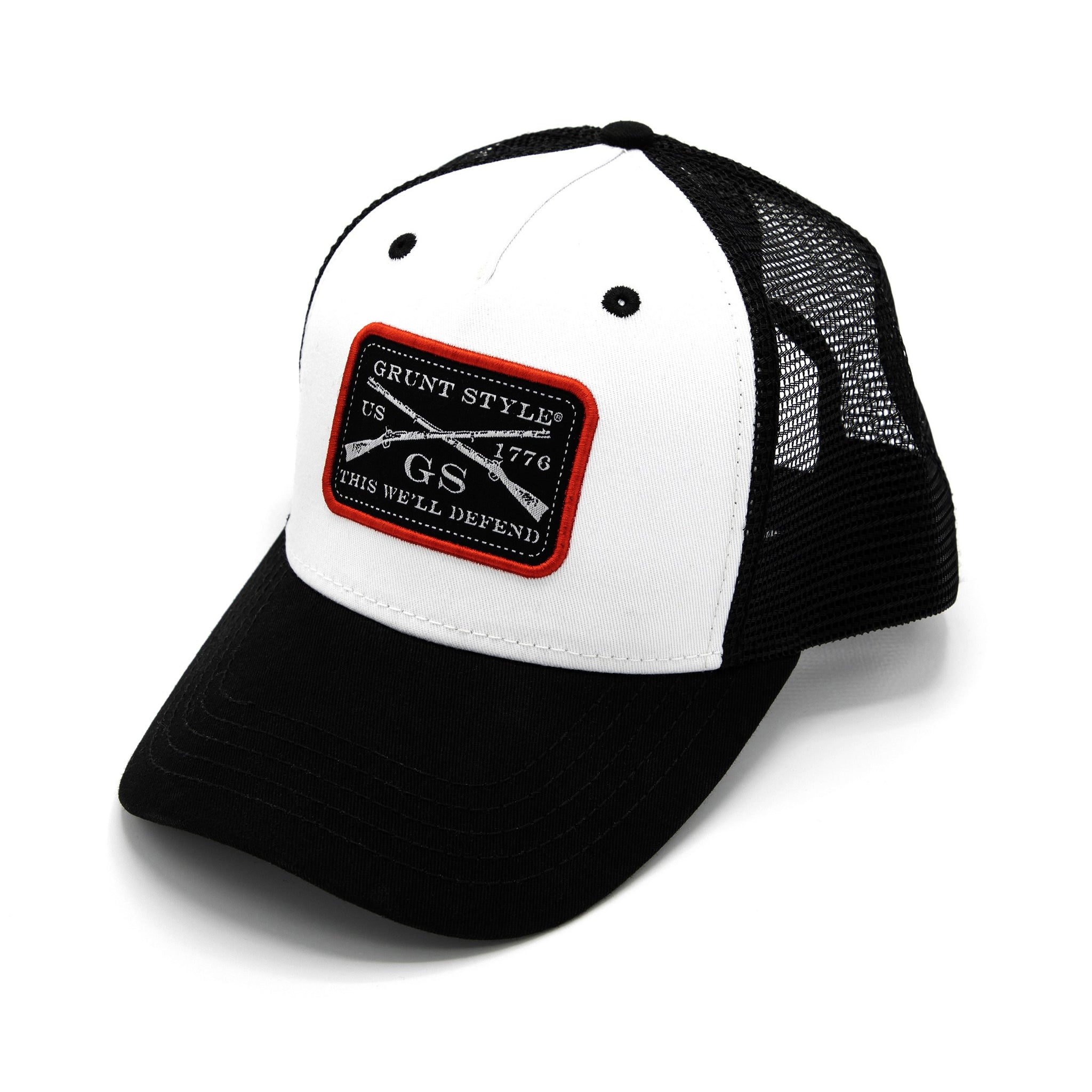 The GS Woven Label Trucker Hat is a structured 5 panel Chino Twill/Mesh Back Cap with a Woven Label & Plastic Snapback Closure.